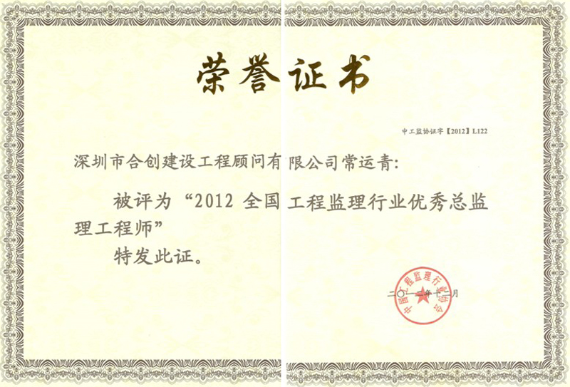 2012全国工程监理行业优秀总监理工程师--常运青