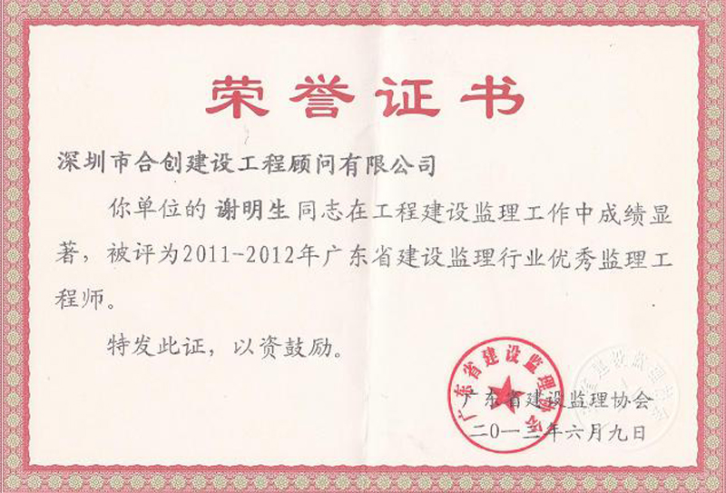 优秀监理工程师-侯建刚2011-2012年广东省建设监理行业