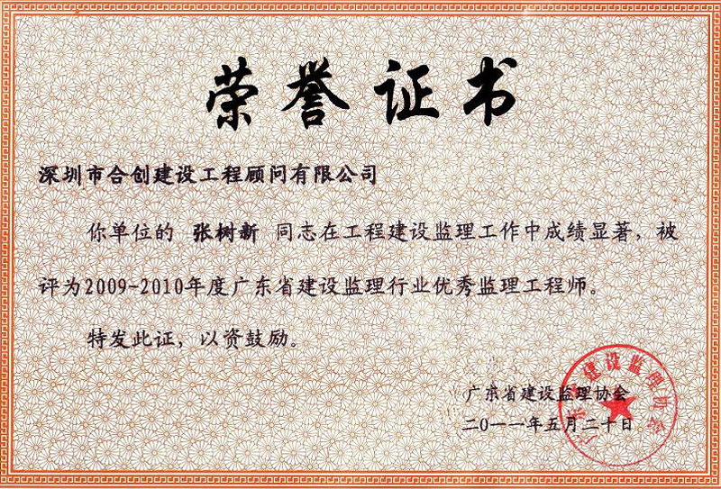 广东省建设监理行业优秀监理工程师--张树新