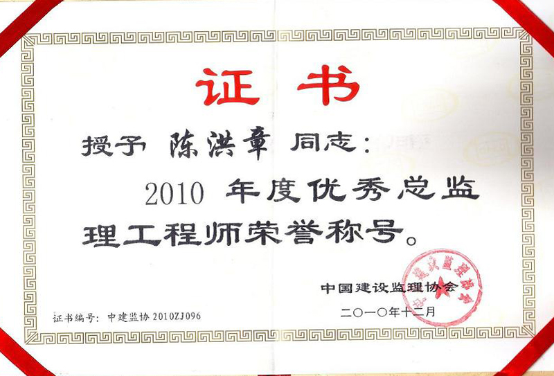 2010年中国建设监理协会优秀总监理工程师-陈洪章