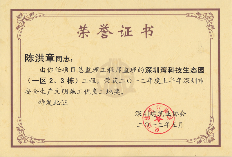 陈洪章--监理的深圳湾科技生态园(一区2、3栋)工程获2013年度上半年深圳市安全生产文明施工优良工地奖