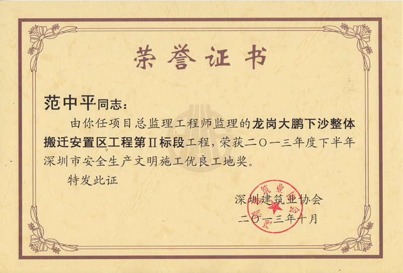 范中平--监理的龙岗大鹏下沙下体搬迁安置区工程(第2标段)获2013年度上半年深圳市安全生产文明施工优良工地奖