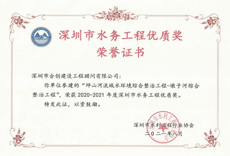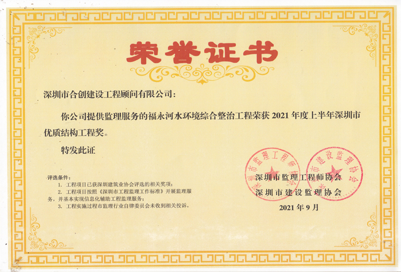 福永河水环境综合整治工程荣获2021年度上半年深圳市优质结构工程奖