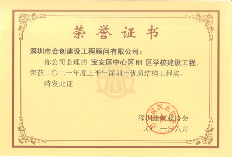 宝安区中心区N1学校建设工程荣获2021年度上半年深圳市优质结构工程奖