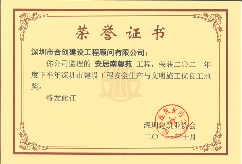 安居南馨苑工程荣获2021年下半年深圳市建设工程安全生产与文明施工优良工地奖