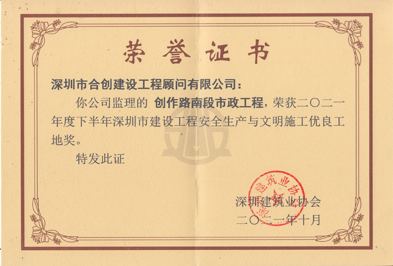 创作路南段市政工程荣获2021年度下半年深圳市建设工程安全产与文明施工优良工地奖