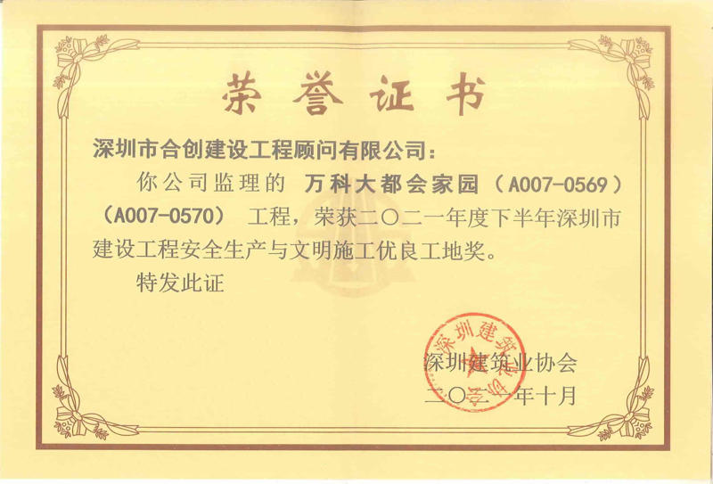 万科大都会(A007-0569)(A007-0570)工程荣获2021年度下半年深圳市建设工程安全生产与文明施工优良工地奖