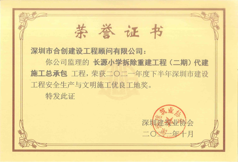 长源小学拆除重新工程(二期)代建施工总承包工程荣获2021年度下半年深圳市建设工程安全生产与文明施工优良工地奖