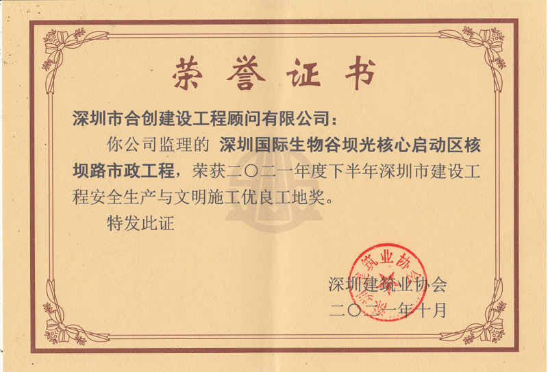 深圳国际生物谷坝光核心启动区核坝路市政工程荣获2021年度下半年深圳市建设工程安全生产与文明施工优良工地奖