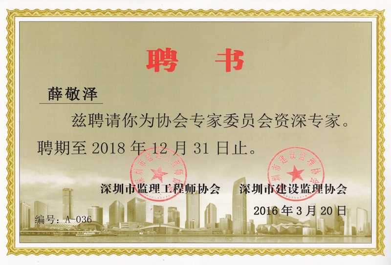 深圳市监理协会专家委员会专家聘书-薛敬泽