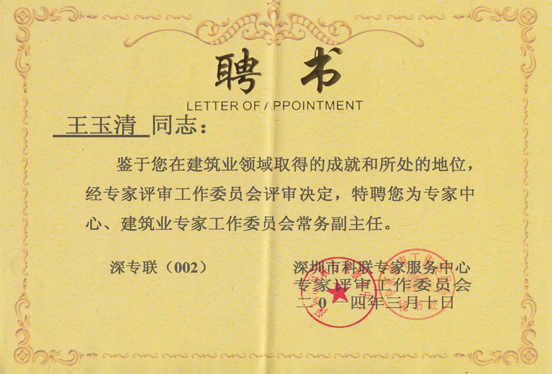 专家中心.建筑业专家工作委员会常务副主任聘书--王玉清