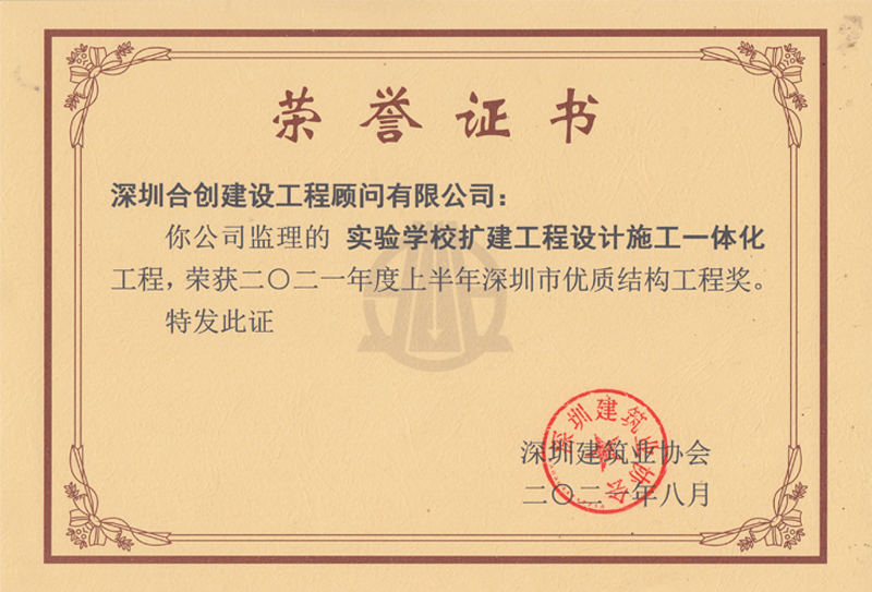 实验学校扩建工程设计施工一体化工程荣获2021年度上半年深圳市优质结构工程奖