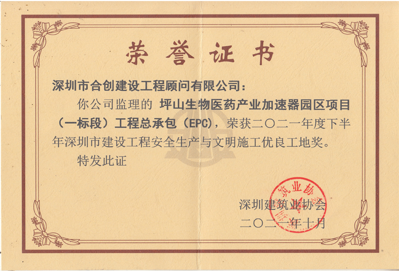 坪山生物医药产业加速器园区项目(一标段)工程总承包(EPC)荣获2021年度下半年深圳市建设工程安全生产与文明施工优良工地奖