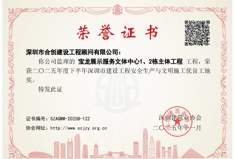岳炜坤任项目总监的宝龙展示服务文体中心1、2栋主体工程工程荣获二〇二五年度下半年深圳市建设工程安全生产与文明施工优良工地奖